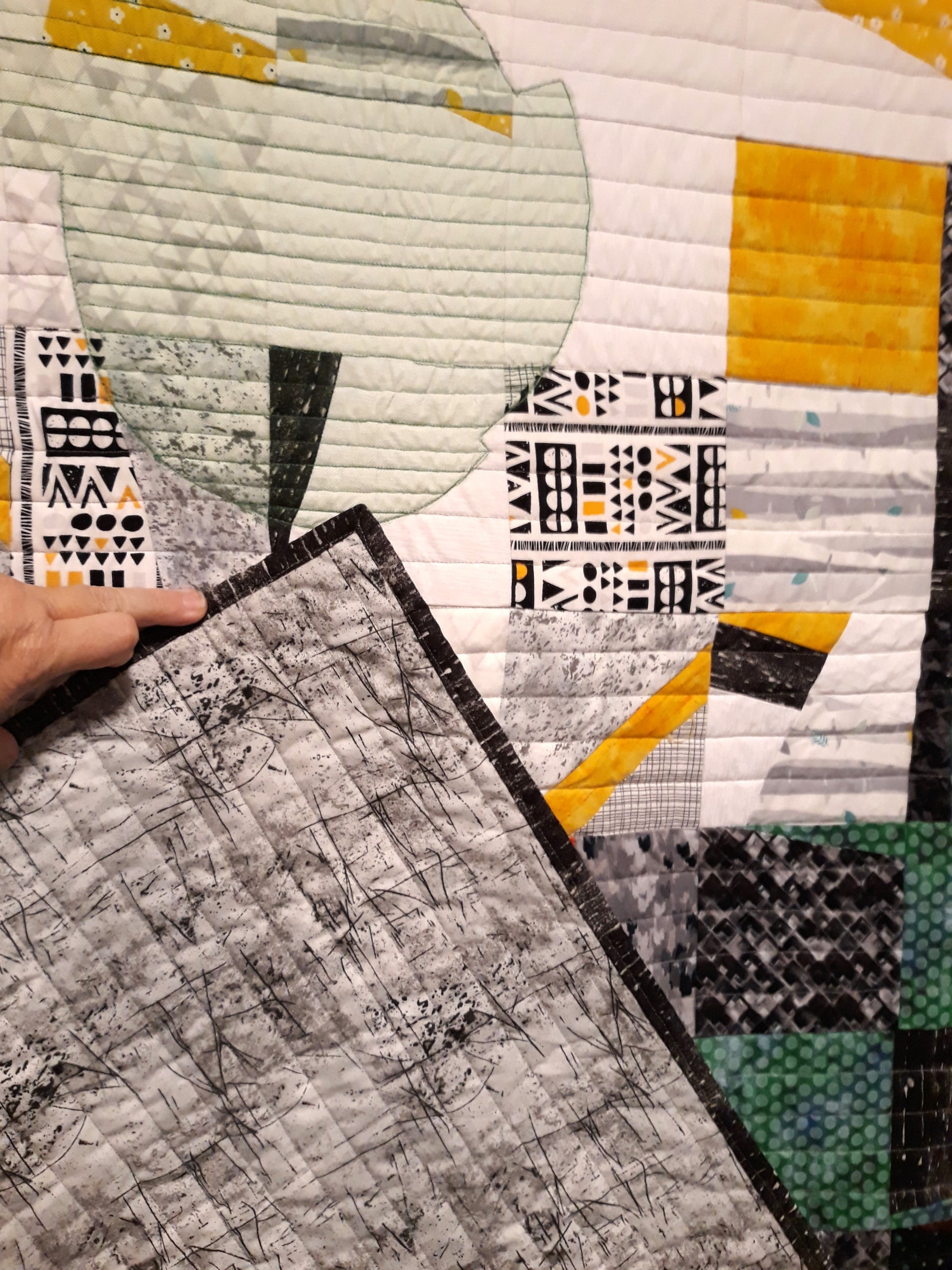 The wall hanging is quilted with horizontal lines. It has a hanging sleeve on the back.