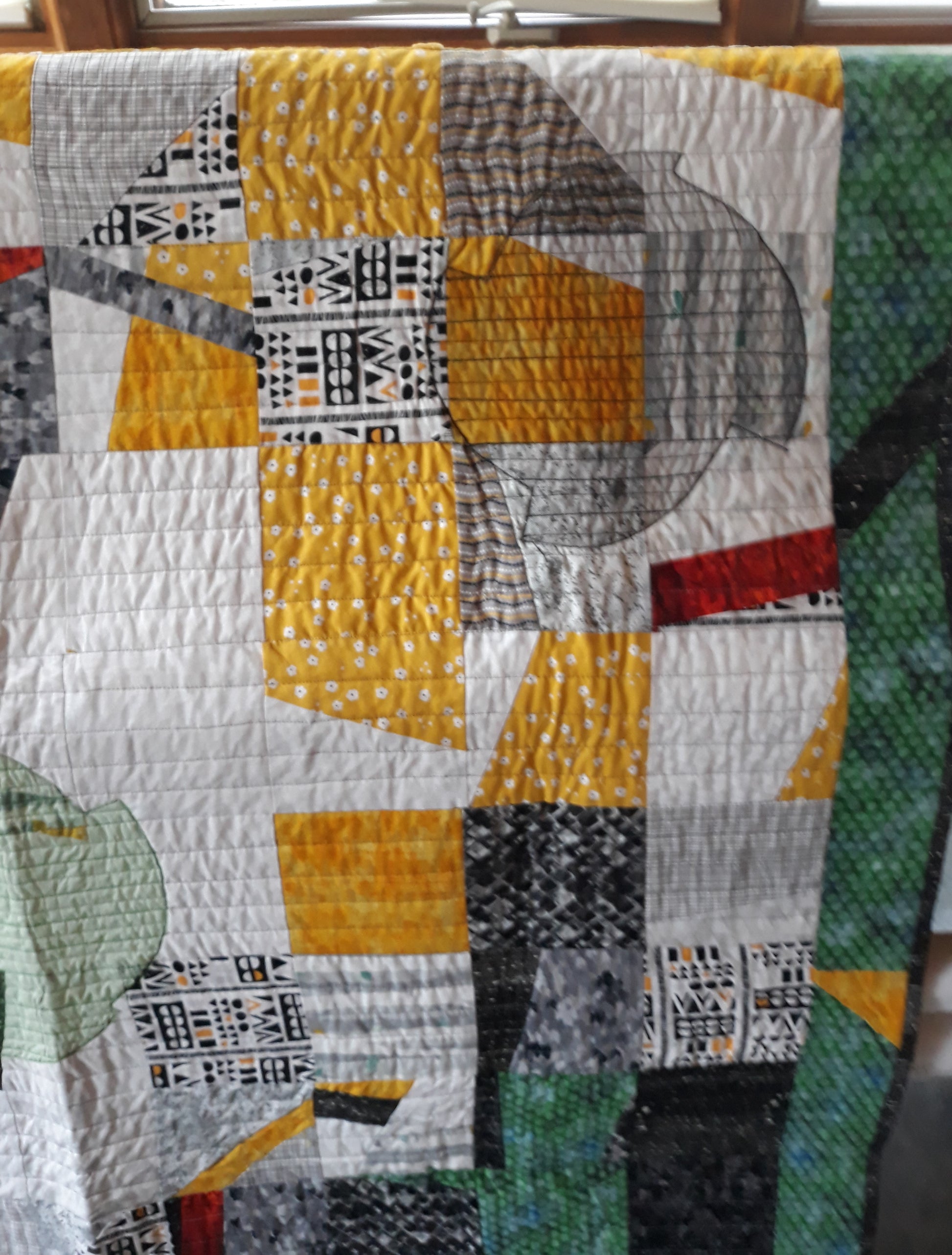 Fractured Squares and Circles Quilt Wall Hanging, approx 50 x 80 inches, yellows, greens, blacks, whites, reds