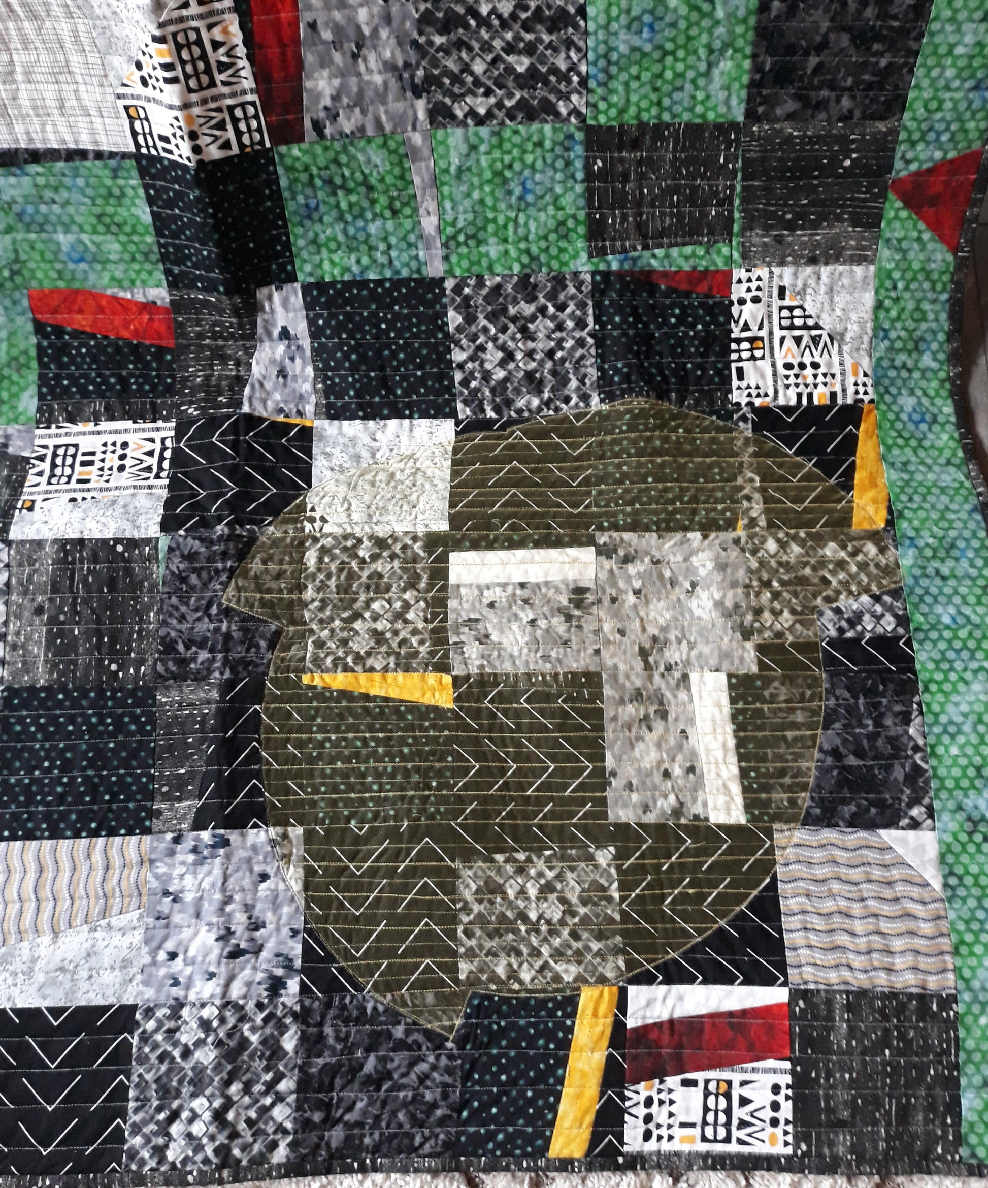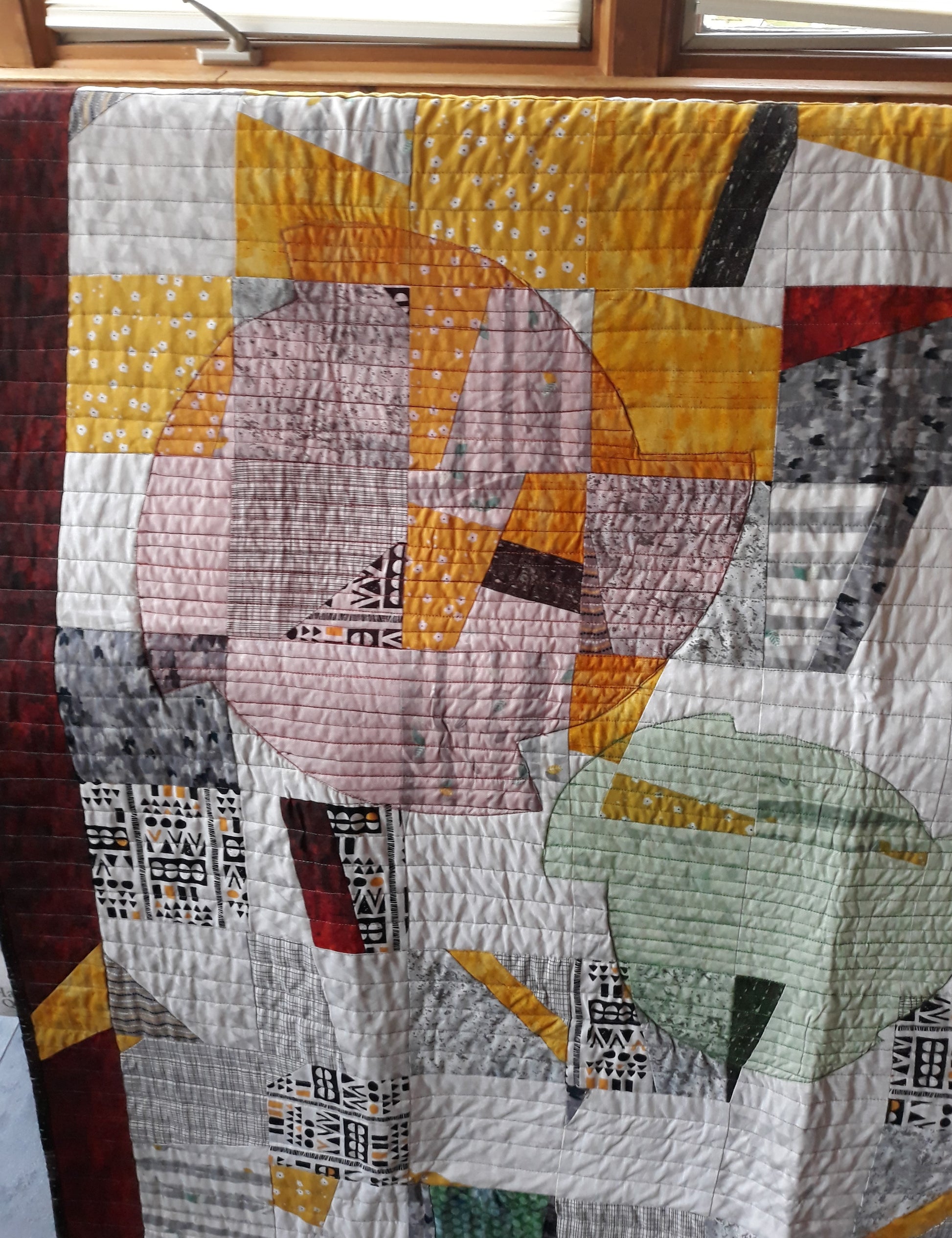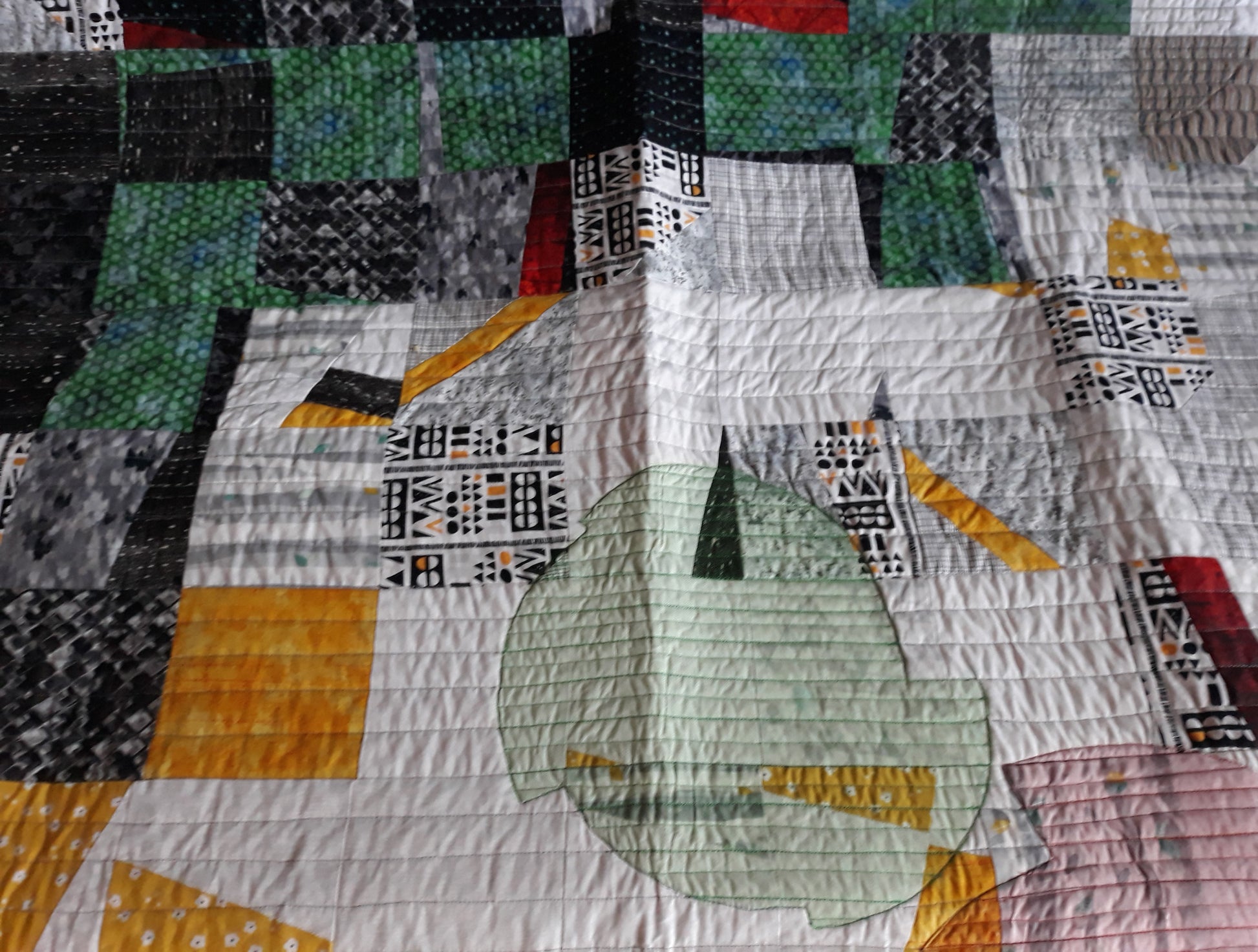 Comprised of squares of white, black, greys, reds, yellows and greens that have been randomly sliced and re-combined and sliced and re-combined yet again. Fractured circles of netting are appliqued over the fractured squares. The quilt backing and binding are grey pattterned cotton.