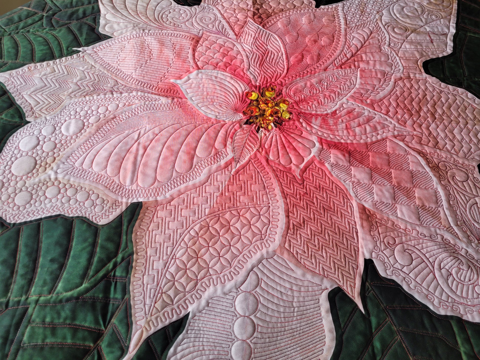 It is quilted with different quilting patterns in each petal. Works best as a wall hanging or a table topper.