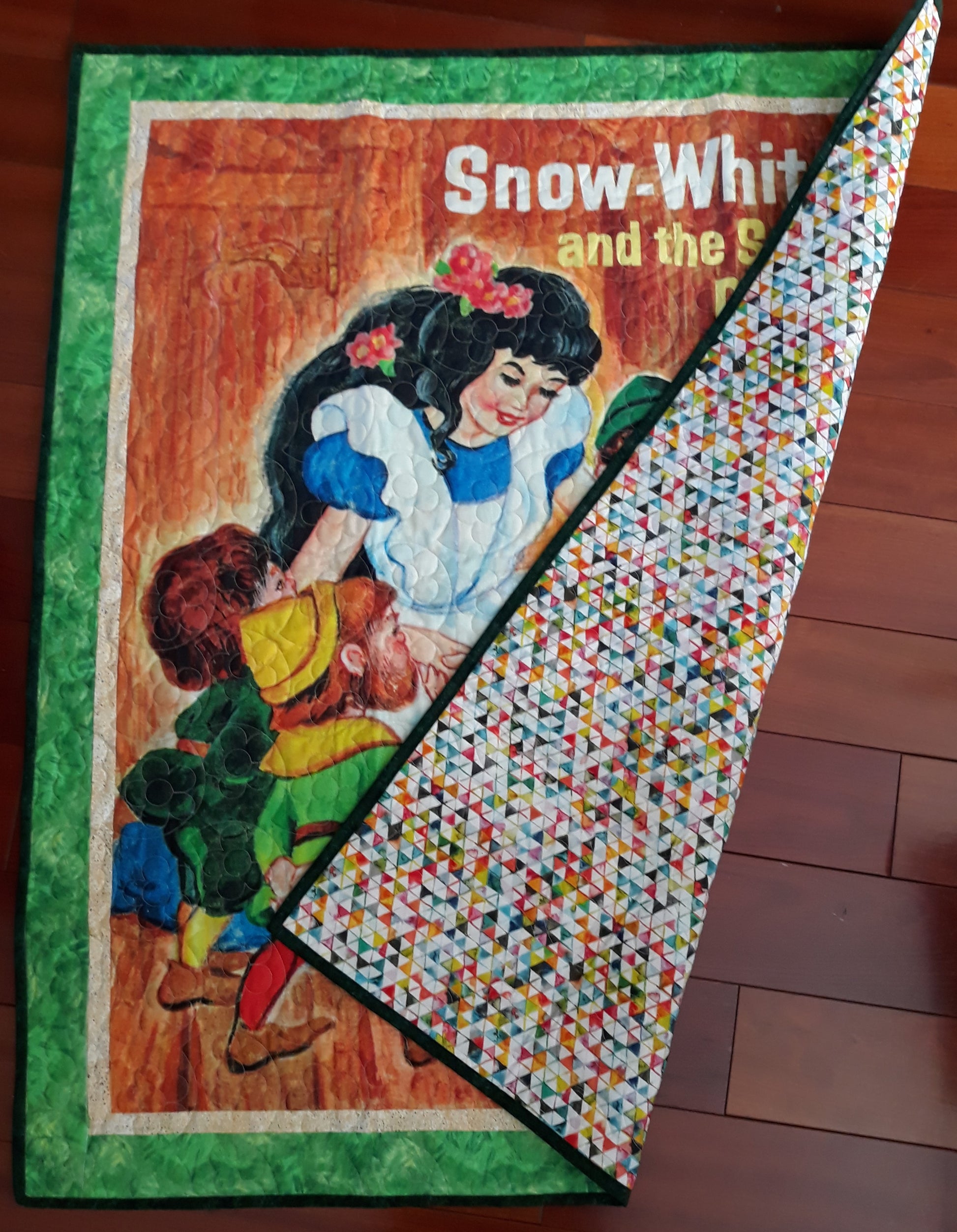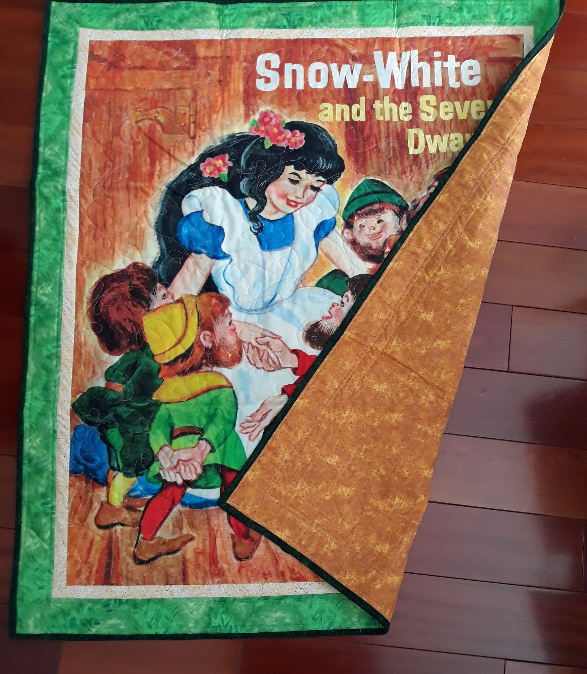This quilt is handmade, machine pieced and longarm quilted. The quilt looks like the cover of a vintage Golden Book copy of Snow White (not the Disney version), There is a thin yellow border and thicker green border. The binding is a dark green.