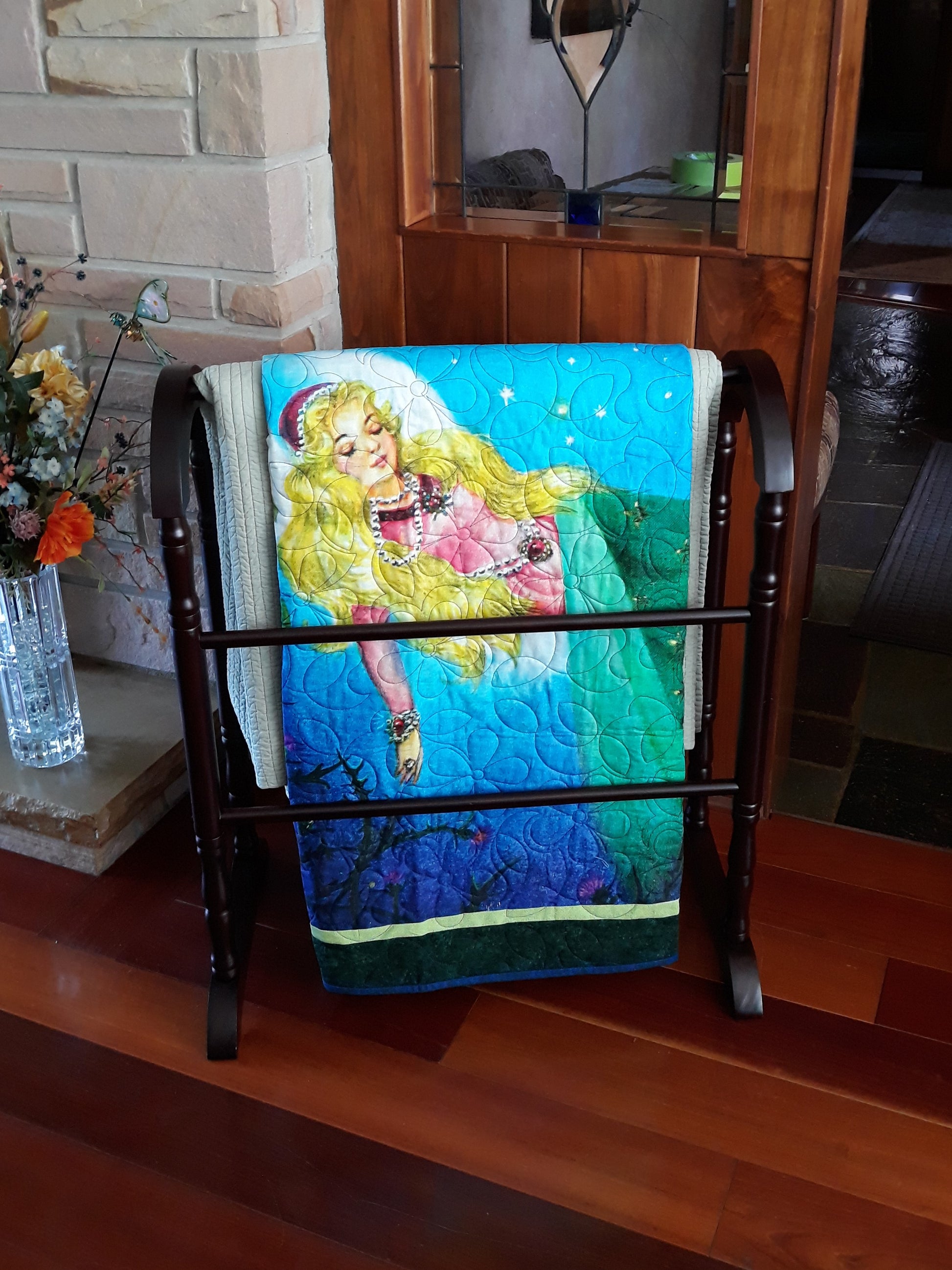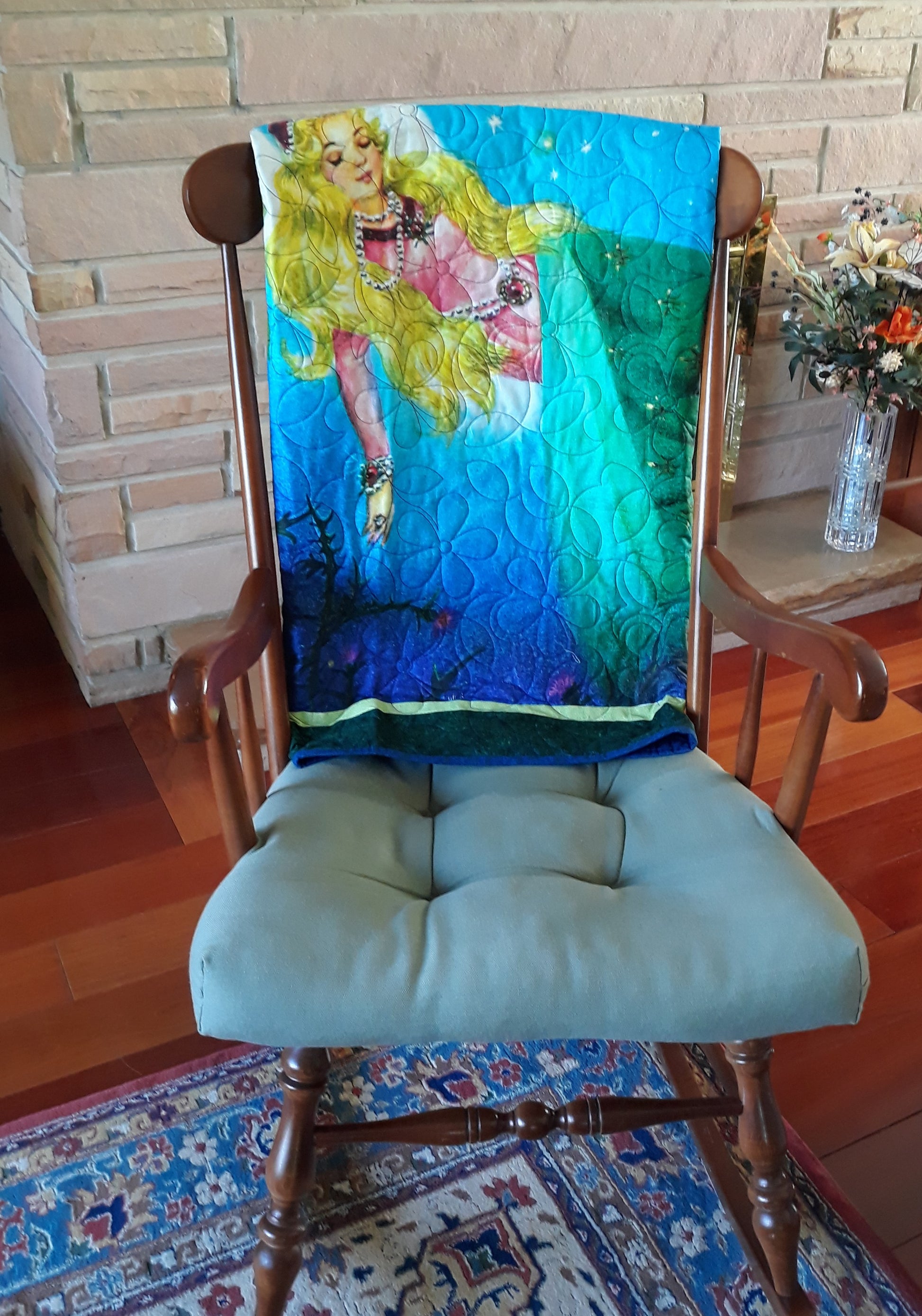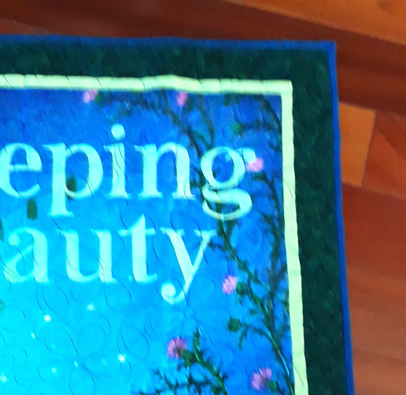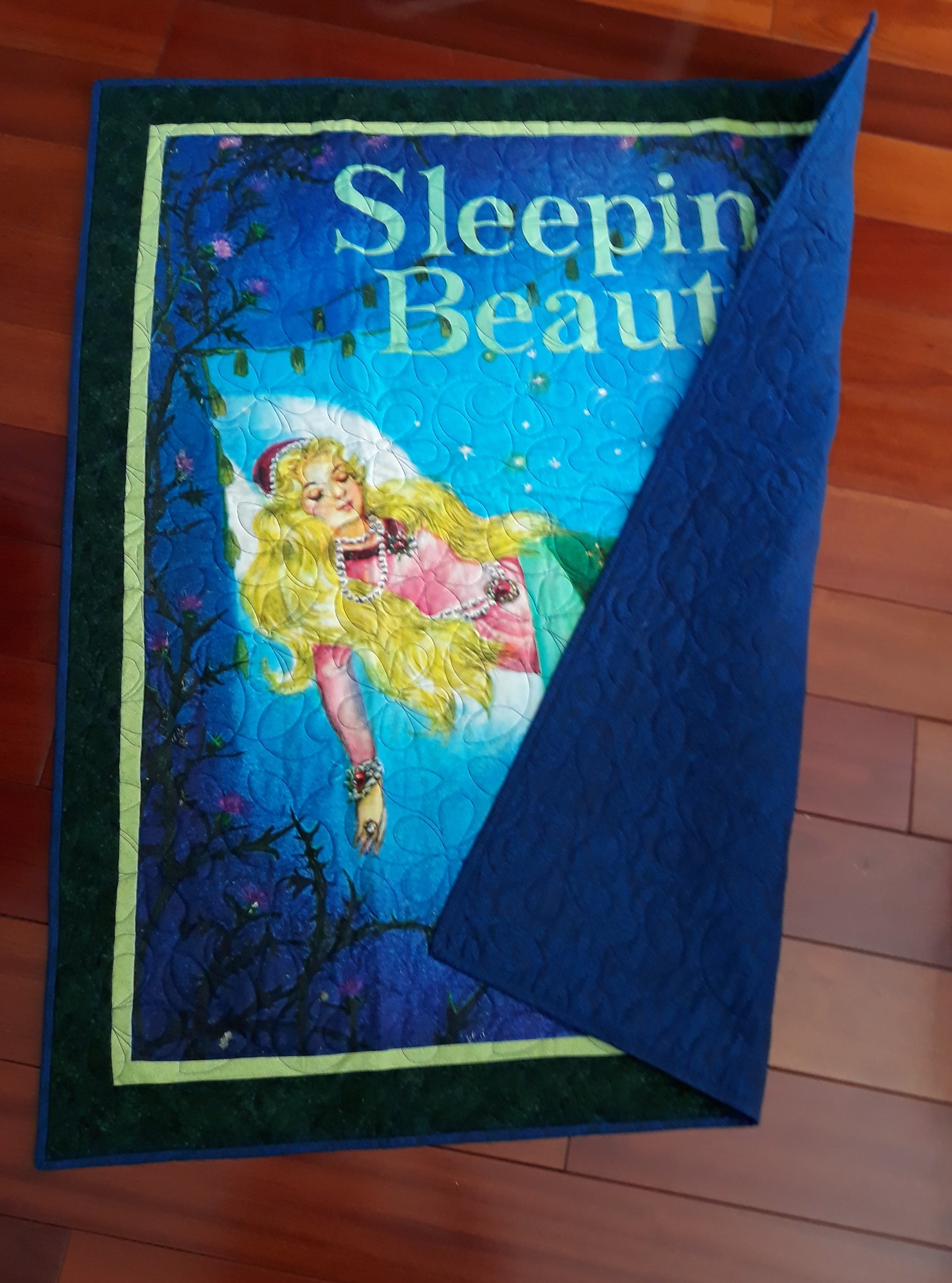 Retro Golden Book Sleeping Beauty Quilt, Wall Hanging, or Playmat. Quilt is Baby / Toddler Size at approximately 41 x 49 inches. The quilt looks like the cover of a vintage Golden Book copy of A Sleeping Beauty (not the Disney version), It is mostly in blues with green borders with dark blue backing and binding.