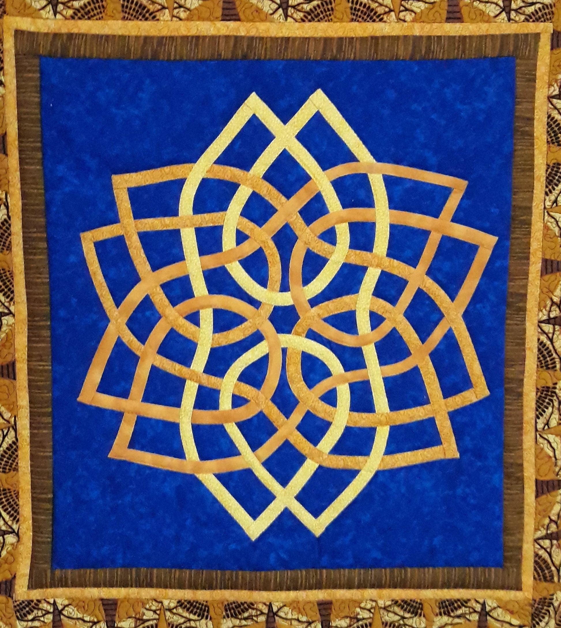 The interlacing Celtic knot is made with 3 gold fabric ribbons and the knot itself sits on a royal blue background The borders are complementing browns and golds. The quilt backing and binding are dark brown.