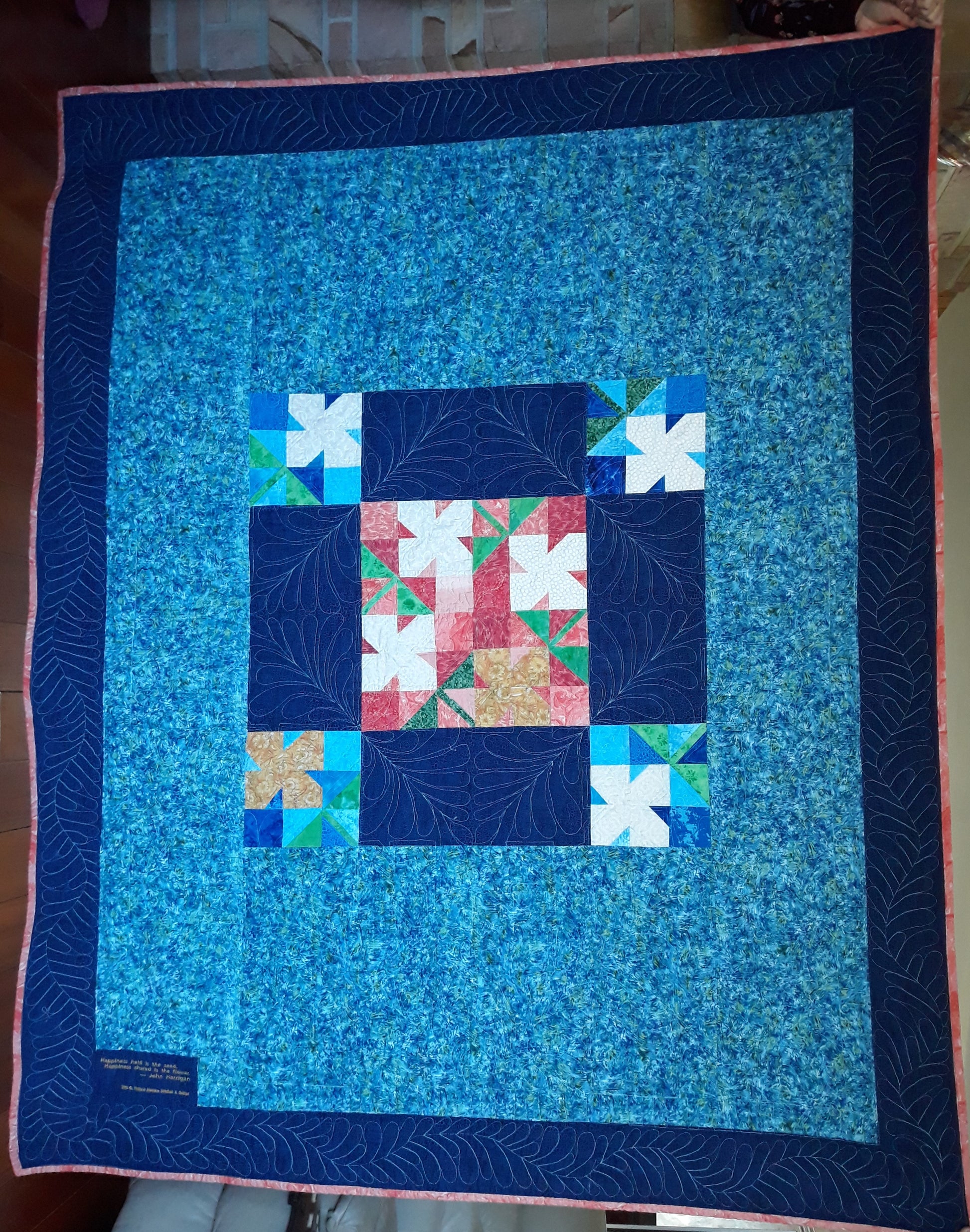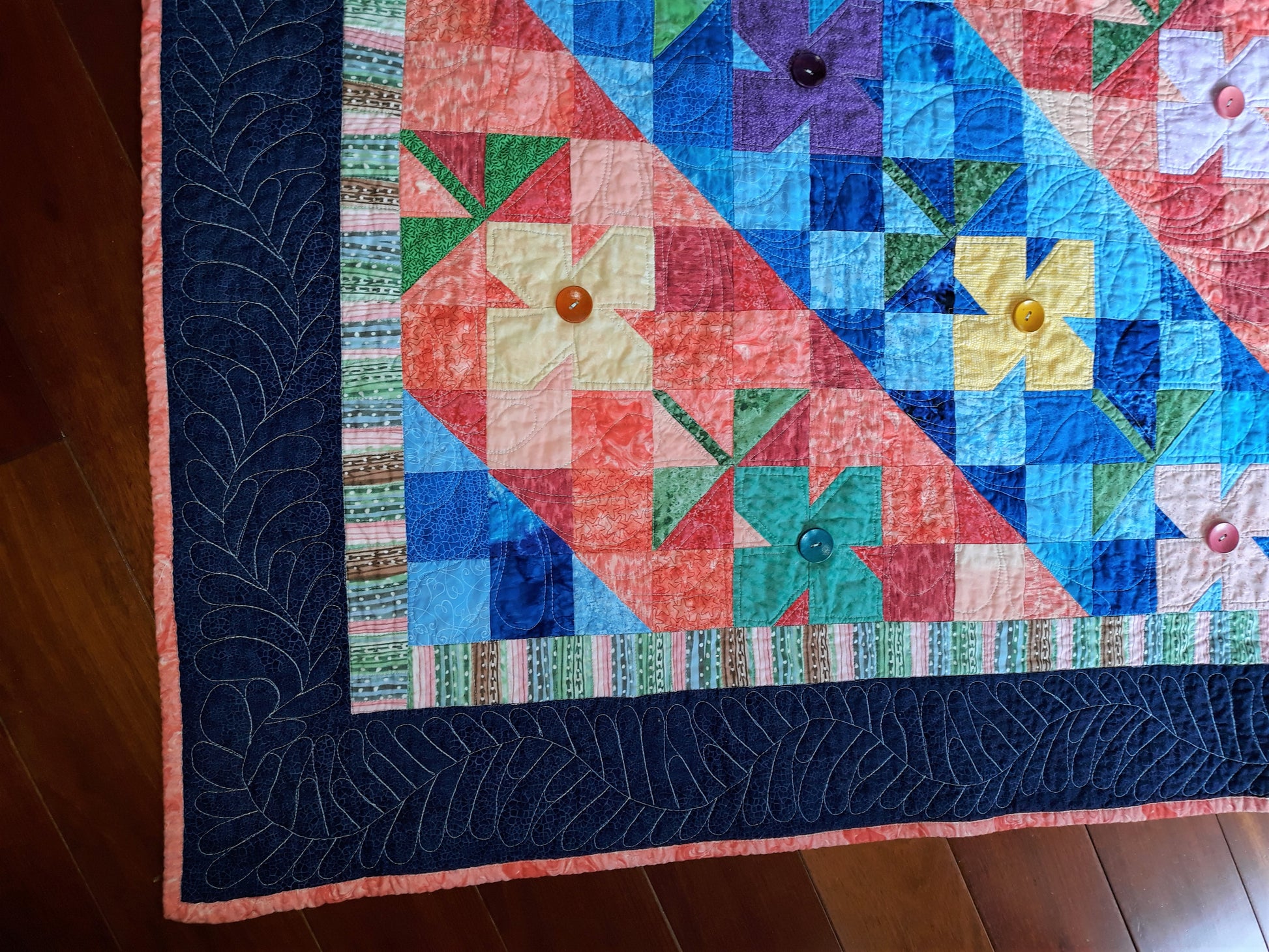 WindBlown Blossoms Quilt 64 x 80 inches, Blue and Coral, two sided quilt, handmade, geometric with colored flowers wooden button centers