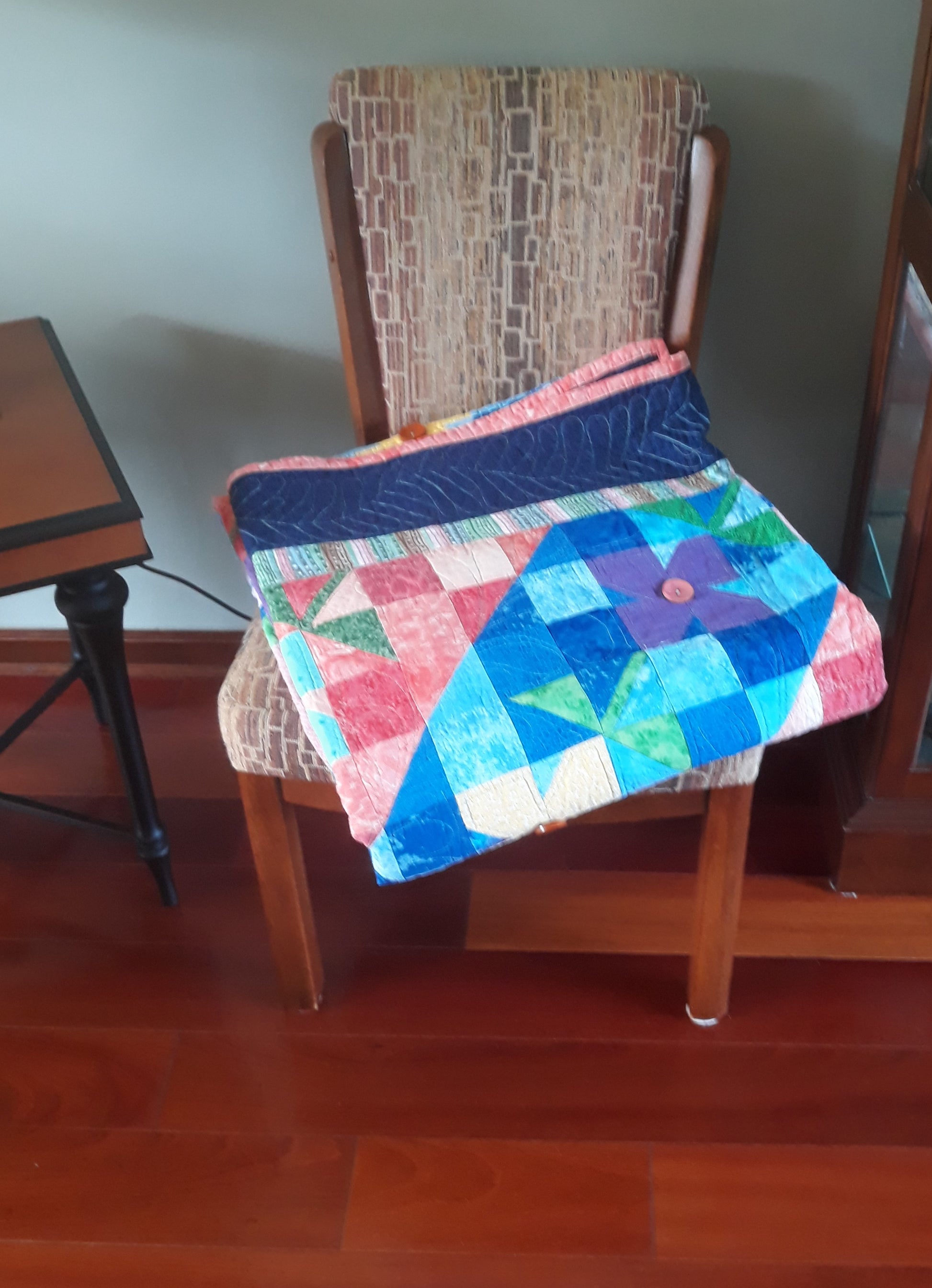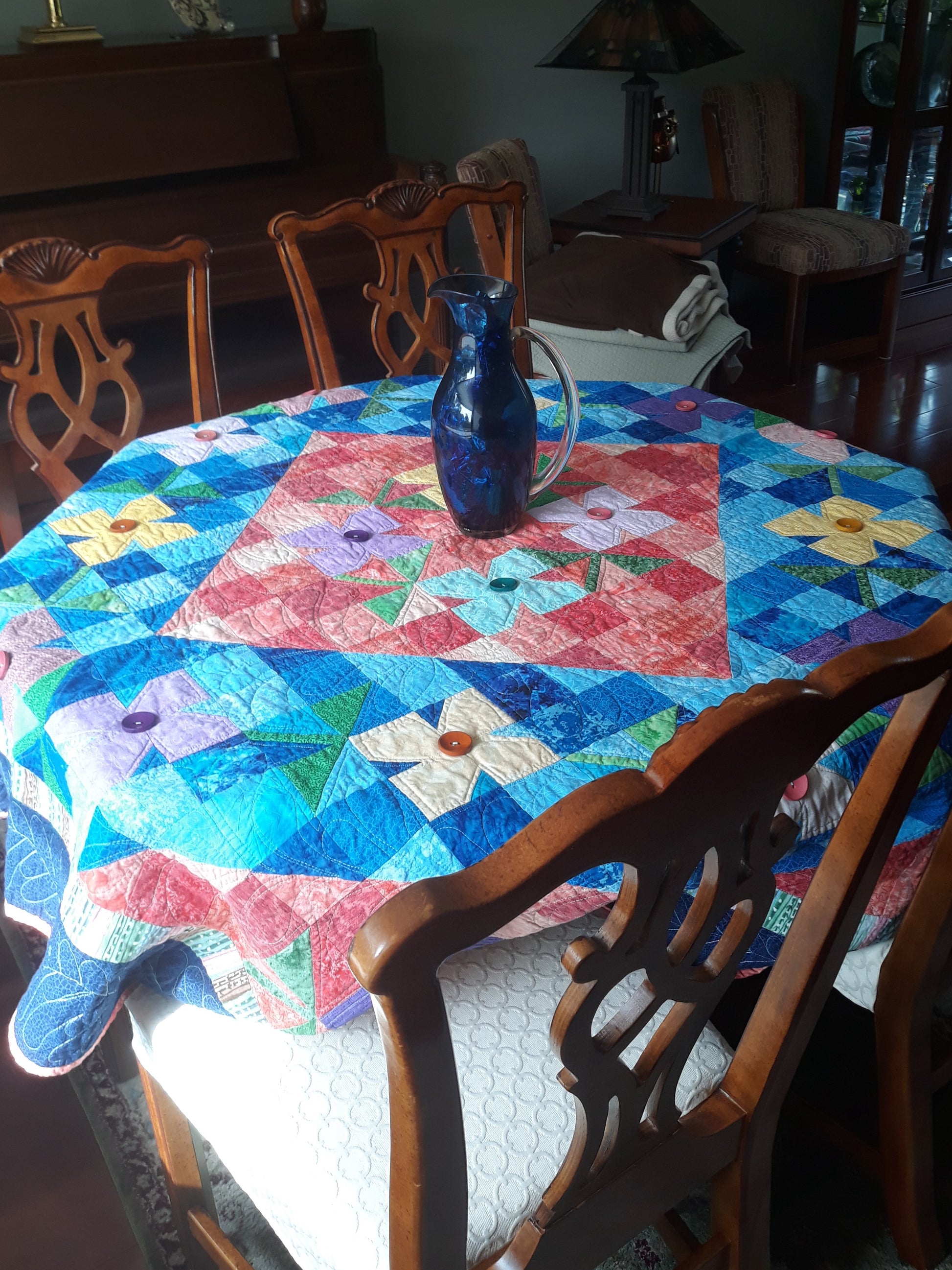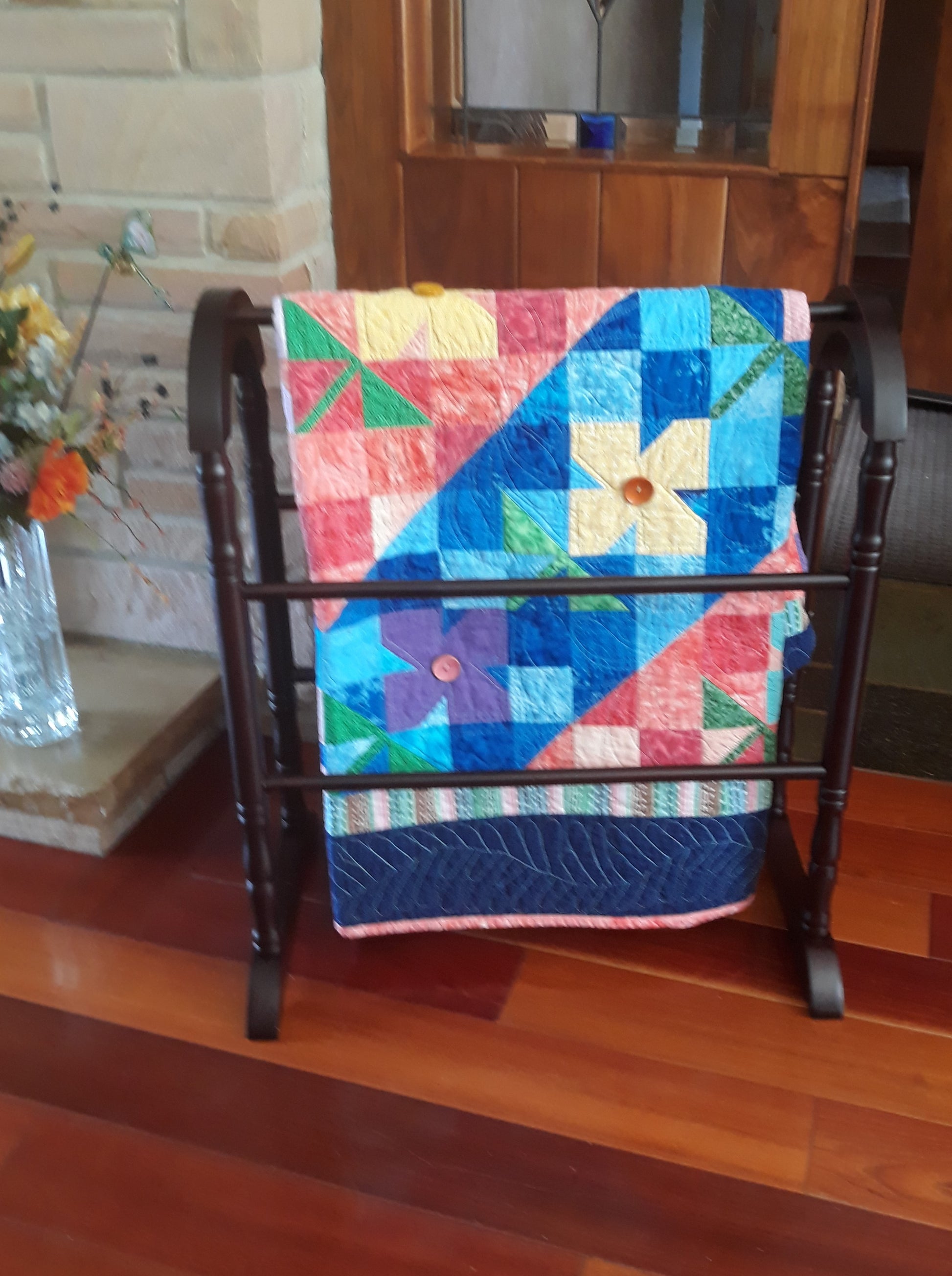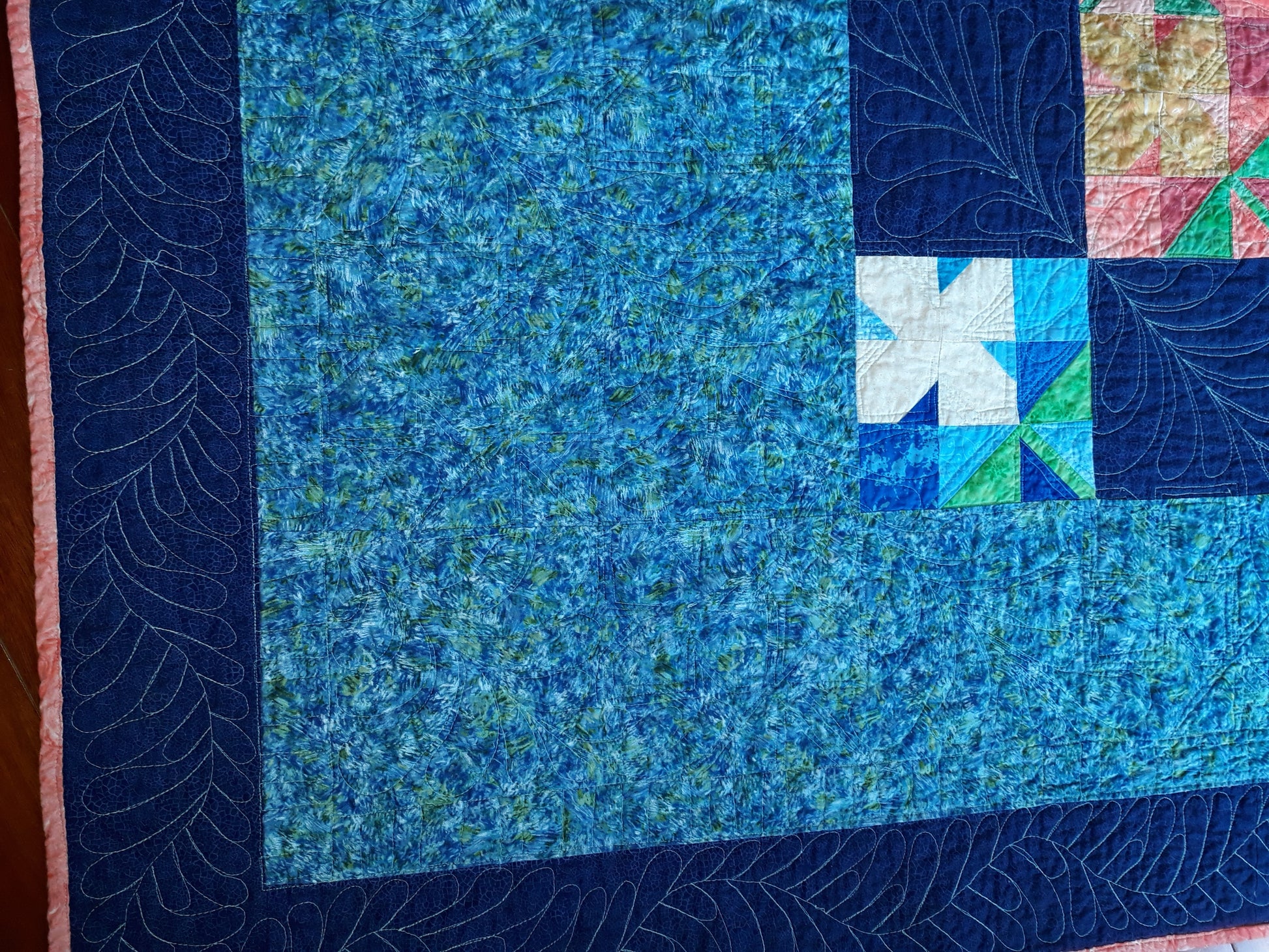 The background is in blues and corals with various pastel colored flowers throughout the quilt. There are wooden button enbellishments in the flower centers. This is a heavily quilted piece -- with a primarily a feather pattern. 100% Cotton