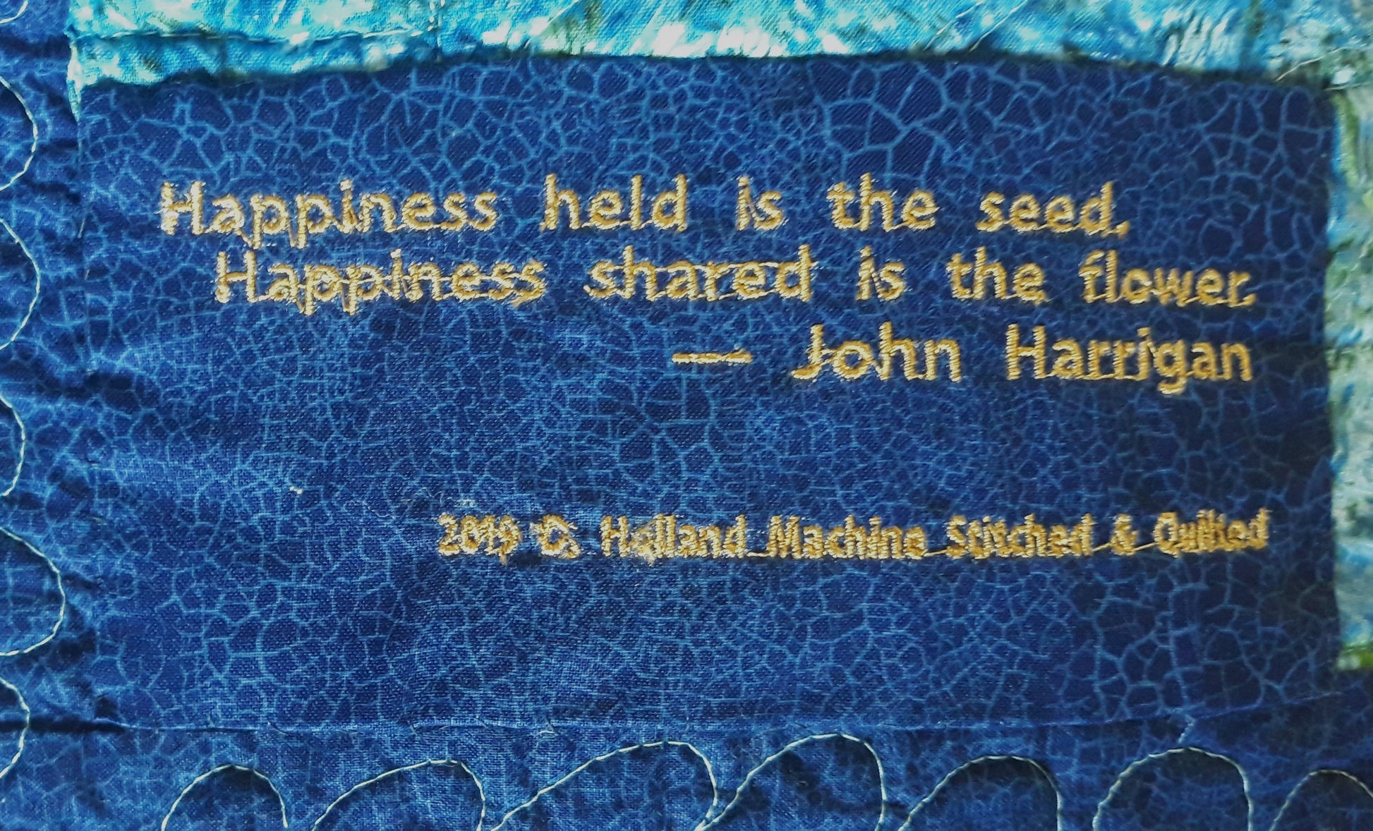 Quote embroidered on back "Happiness held is the seed. Happiness shared is the flower." ---John Harrigan